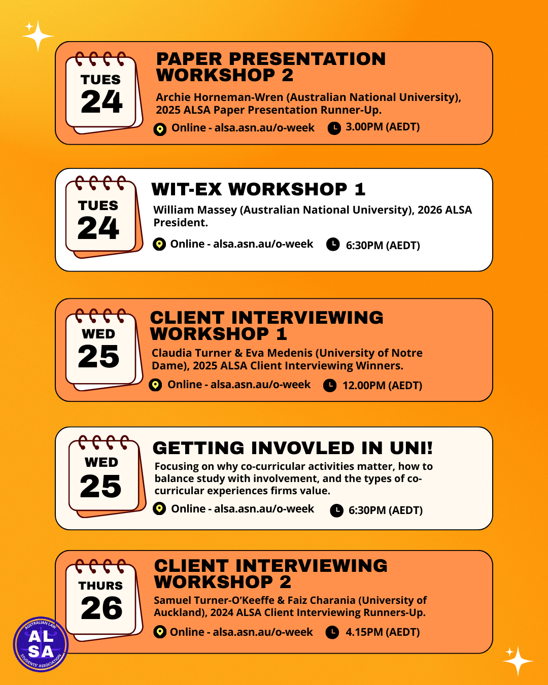 ALSA is bringing you a packed program of free online workshops designed to set you up for success from day one of law school.
